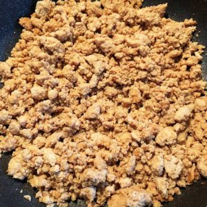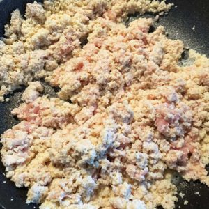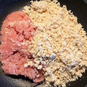 フライパンで鶏ひき肉と高野豆腐を炒めます