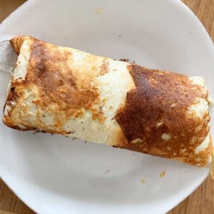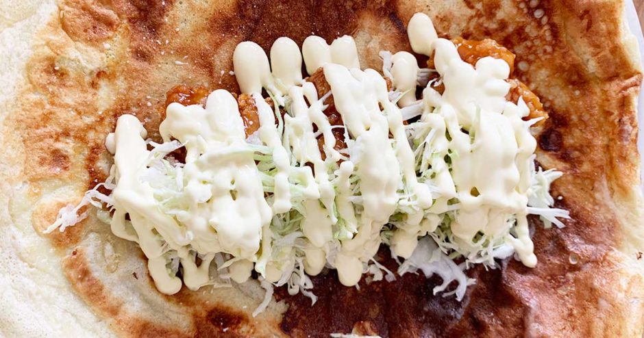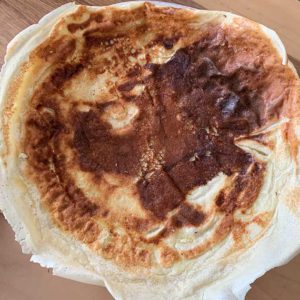 クレープよりも少し厚くします。シェイカーの1/3量を流し入れてください。