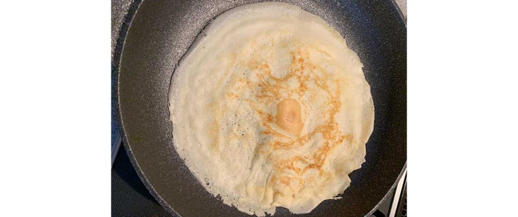 クレープよりも少し厚くします。シェイカーの1/3量を流し入れてください。
